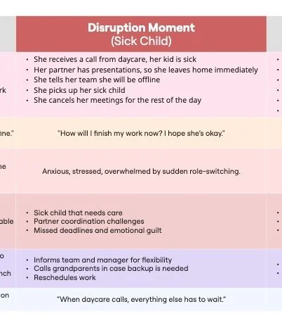 But disruption moments, like a sick child or unexpected school call, trigger stress and identity conflict, showing the need for structures that allow flexibility without penalty.
